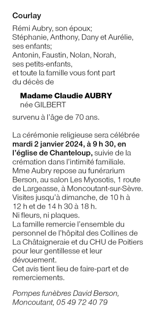 Décédée à La Châtaigneraie (85120, France) le jeudi 28 décembre 2023 à l'âge de 70 ans