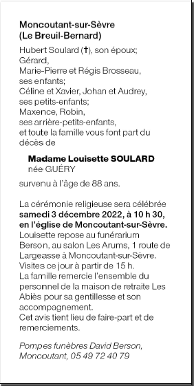 Décédée à Faye-l'Abbesse (79350, France) le mercredi 30 novembre 2022 à l'âge de 88 ans