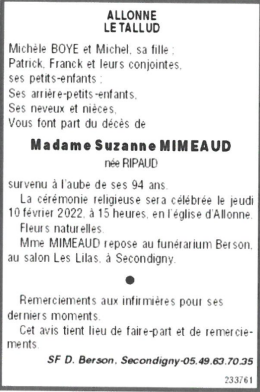 Décédée à Beceleuf (79160, France) le mardi 8 février 2022 à l'âge de 93 ans