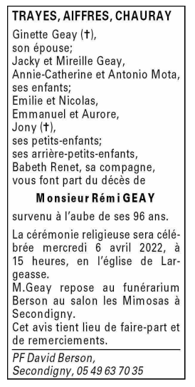 Décédé à Secondigny (79130, France) le dimanche 3 avril 2022 à l'âge de 95 ans