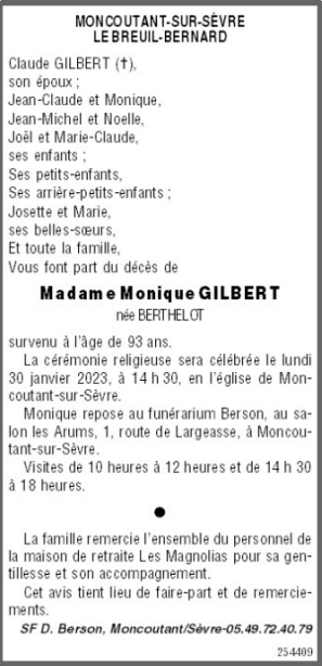 Décédée à Moncoutant-sur-Sèvre (79320, France) le vendredi 27 janvier 2023 à l'âge de 93 ans