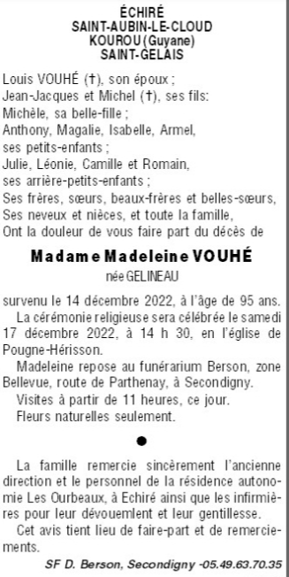 Décédée à Echire (79410, France) le mercredi 14 décembre 2022 à l'âge de 95 ans