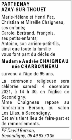 Décédée à Parthenay (79200, France) le mercredi 1 décembre 2021 à l'âge de 95 ans