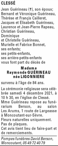 Madame Raymonde GUÉRINEAU née LIGONNIÈRE