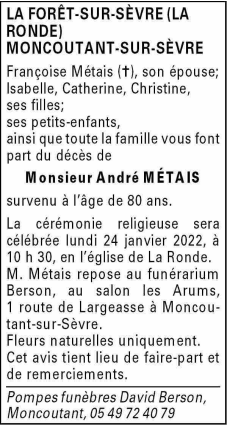 Décédé à Moncoutant-sur-Sèvre (79320, France) le mardi 18 janvier 2022 à l'âge de 80 ans