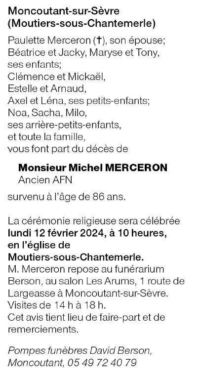 Décédé à Moutiers sous Chantemerle (79320, France) le jeudi 8 février 2024 à l'âge de 86 ans