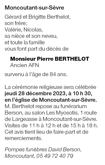 Décédé à Moncoutant-sur-Sèvre (79320, France) le samedi 23 décembre 2023 à l'âge de 84 ans
