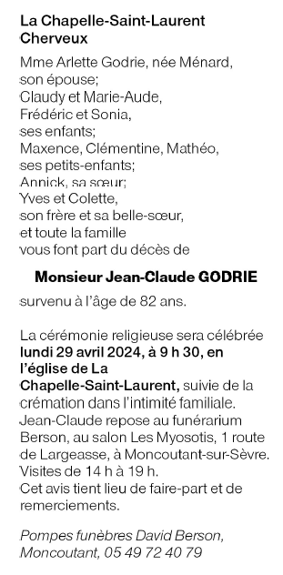 Décédé à Faye-l'Abbesse (79350, France) le jeudi 25 avril 2024 à l'âge de 82 ans
