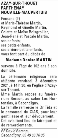Décédée à Azay-sur-Thouet (79130, France) le mercredi 1 décembre 2021 à l'âge de 102 ans
