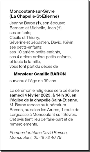 Décédé à Mouilleron en Pareds (85390, France) le mercredi 1 février 2023 à l'âge de 99 ans